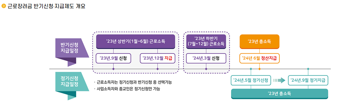 소득 발생시점과 장려금 수급시점 간 시차가 크게 발생하는 기존 장려금 지급제도의 단점을 보완하려고 장려금 지원의 실질적인 체감도를 높이기 위해 반기별 소득파악이 가능한 근로소득자에 한하여 당해연도 소득을 기준으로 근로장려금을 반기별로 신청/지급할 수 있도록 2019년부터 시행된 제도.